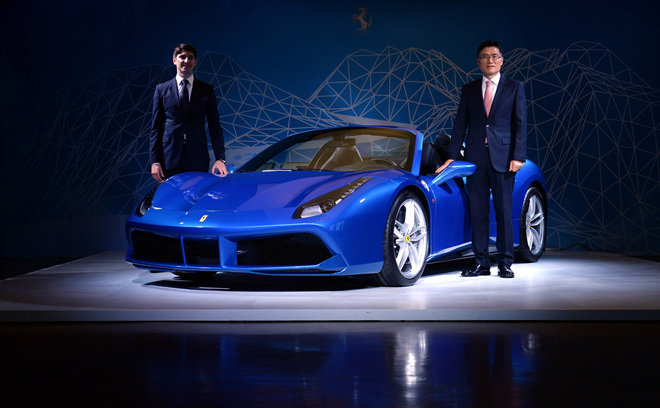 이탈리아 슈퍼카 브랜드 ‘페라리’가 17일 오전 서울 강남구 논현동 인터와이드 스튜디오에서 페라리 역사상 가장 강력한 8기통 엔진을 장착한 '488 스파이더'를 국내에 공식 출시행사를 갖고 한국,일본 총괄 디렉터 레노 데 파올리와 FMK 김광철 대표이사가 포즈를 취하고 있다.