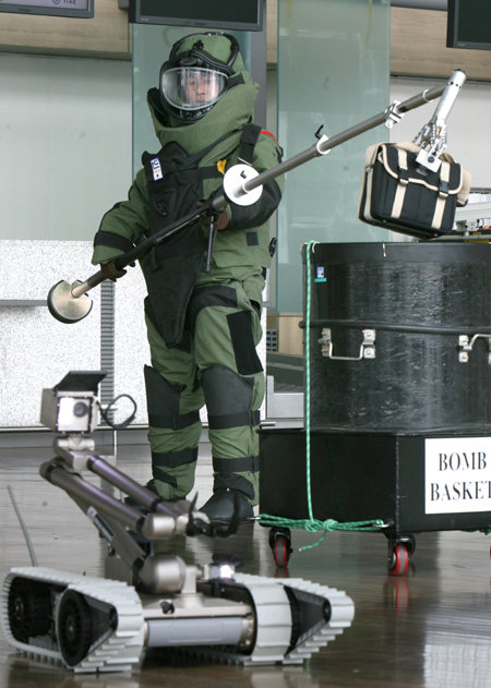 등록 2006.03.22.22일 인천국제공항에서 열린 폭발물 테러 대비 훈련에 참가한 폭발물처리반 대원들이 방호복을 입은채 폭발물로 의심되는 가방을 폭발물 바스켓에 옮기고 있다. 이날 훈련은 21일 창설된 `테러사건합동조사반`의 첫 훈련으로 국정원 서울지방항공청 경찰 기무사 법무부 항공사 등 공항 상주기관 대테러 담당자들이 참여했다.