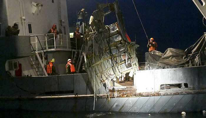 등록 2016.12.28.러시아 소치 인근 흑해에 25일 추락해 ‘붉은 군대 합창단’으로 불리는 러시아군 소속 알렉산드로프 앙상블 단원을 비롯한 탑승객 92명 전원의 목숨을 앗아간 러시아 투폴레프(Tu)-154 항공기 잔해를 26일 수색대원들이 바다에서 건지고 있다. 러시아 인테르팍스통신은 인양된 사고기 기체 잔해와 탑승객 시신에서 폭발물 흔적이 발견되지 않았으며 블랙박스도 해저에서 수습돼 해독 작업이 곧 이뤄질 것이라고 27일 전했다.
